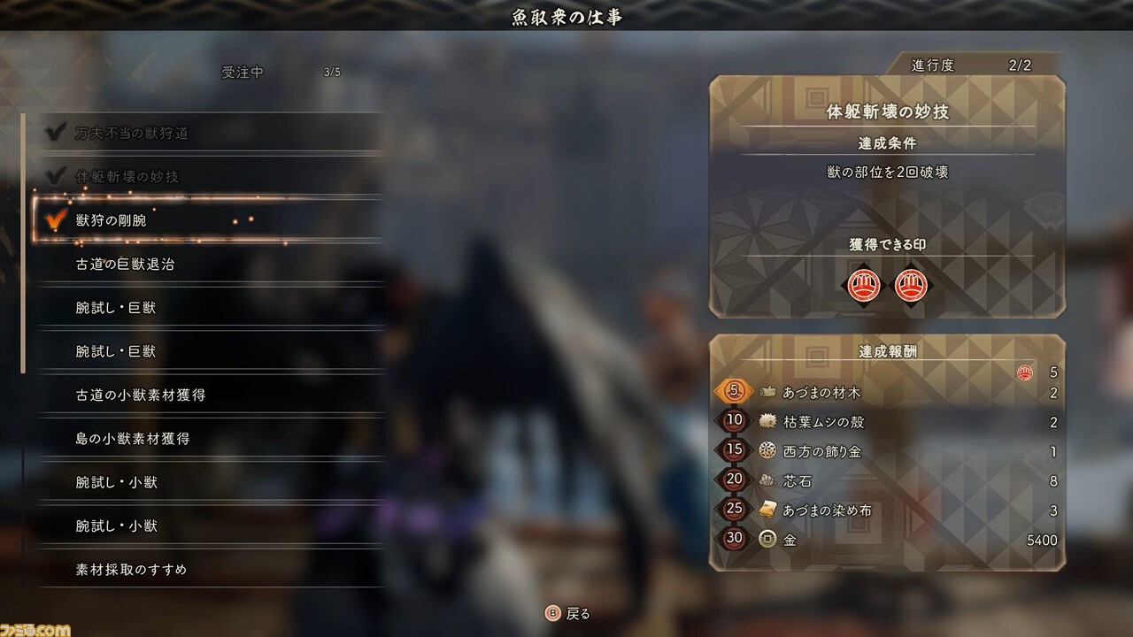 미나토의 마을에 있는 시노미츠로부터, 달성해 보고하는 것만으로 끝나는 범용계의 임무를 최대 5개 수주할 수 있다. 소재 아이템이나 돈이 손에 들어오므로 가급적 최대까지 수주한 후 사냥에 나가는 것이 추천이다.