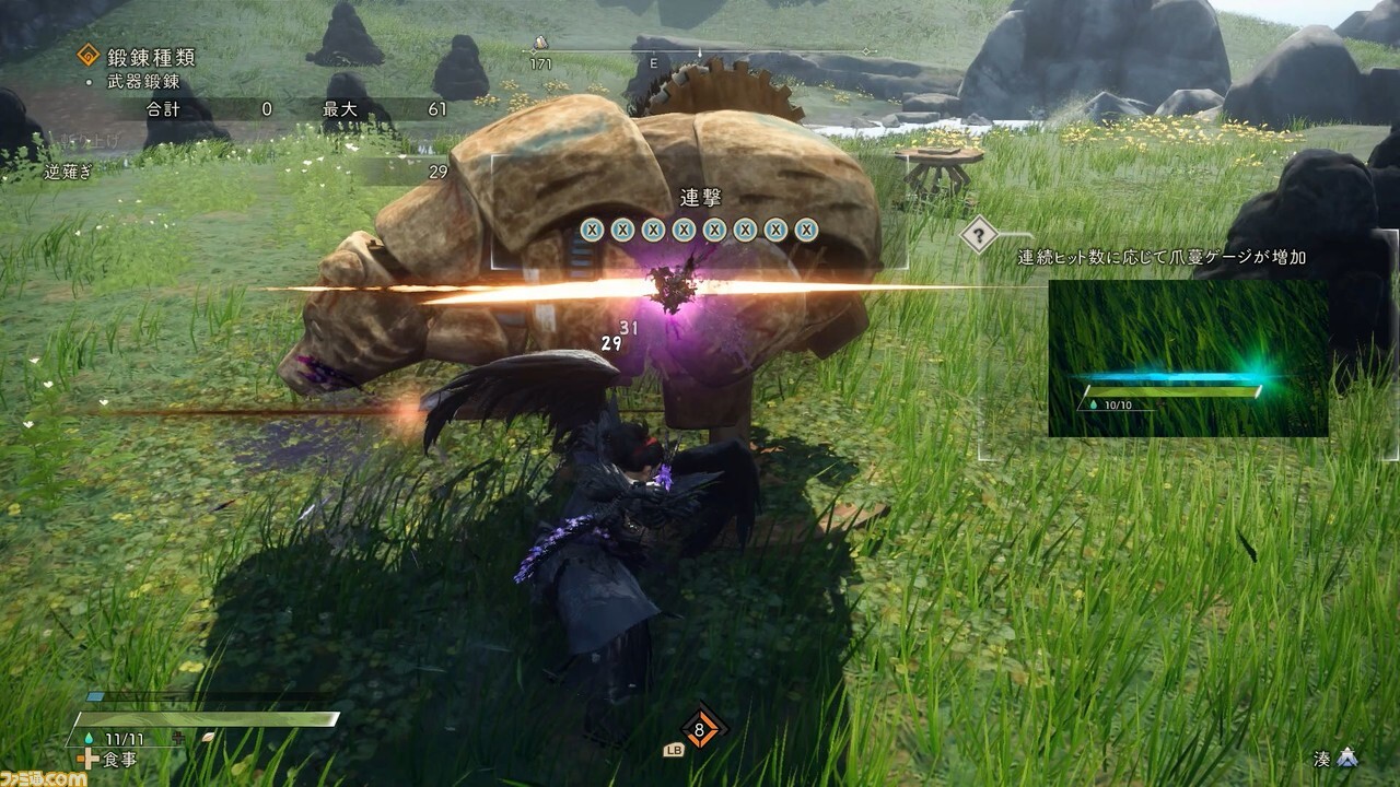 예를 들어 돌진공격에는 '벽', 비행하는 적을 겁먹게 떨어뜨리는 '섬광 불꽃' 등 성공하면 적이 다운되고 일방적으로 공격할 수 있는 찬스 타임이 태어난 것이다. 다만, 어느 연결에서 구리가 효과가 있는지는 싸우면서 시험하는 것이 기본이 된다.