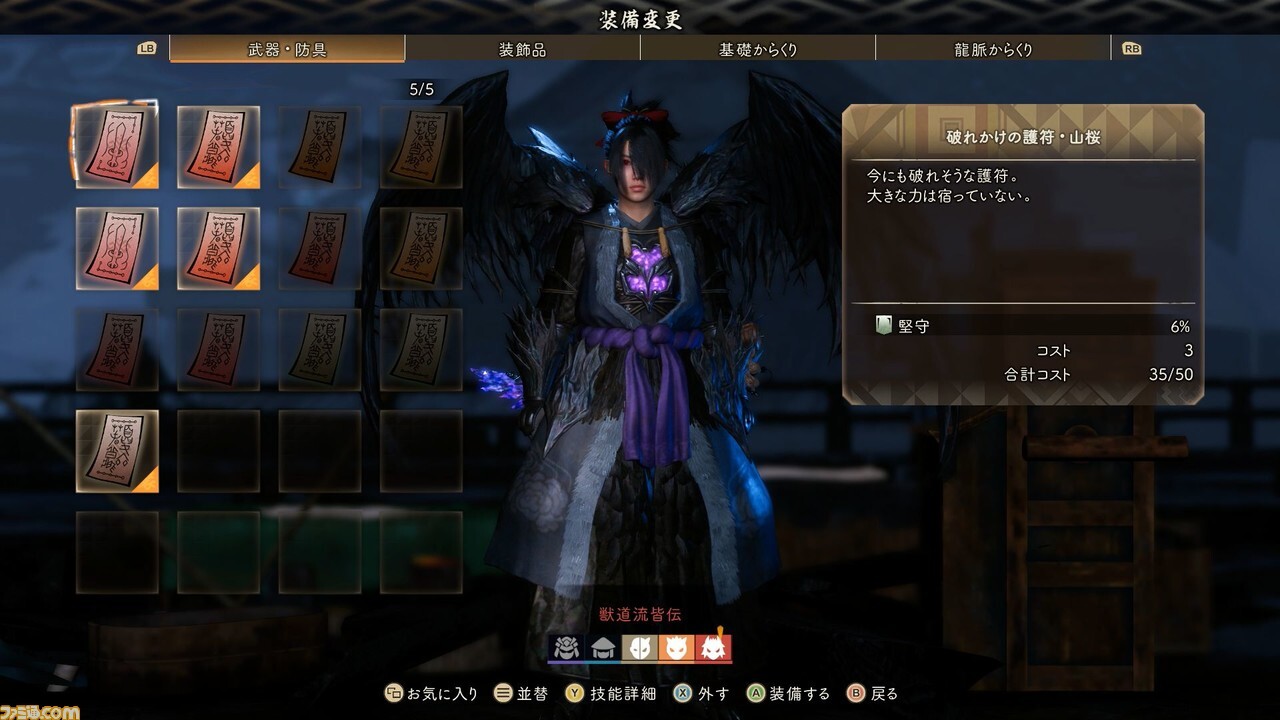 장비 아이템의 하나인 부적. 필드 탐색으로 손에 넣는 것 외에, 대형의 짐승을 쓰러뜨리면 확률로 드롭하는 일이 있다. 부적은 1개 뿐만 아니라 최대 5개까지 동시 장비할 수 있으므로 손에 넣으면 잊지 않고 장비해 두고 싶다.