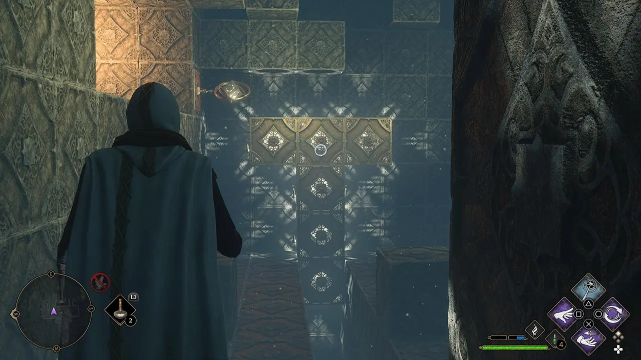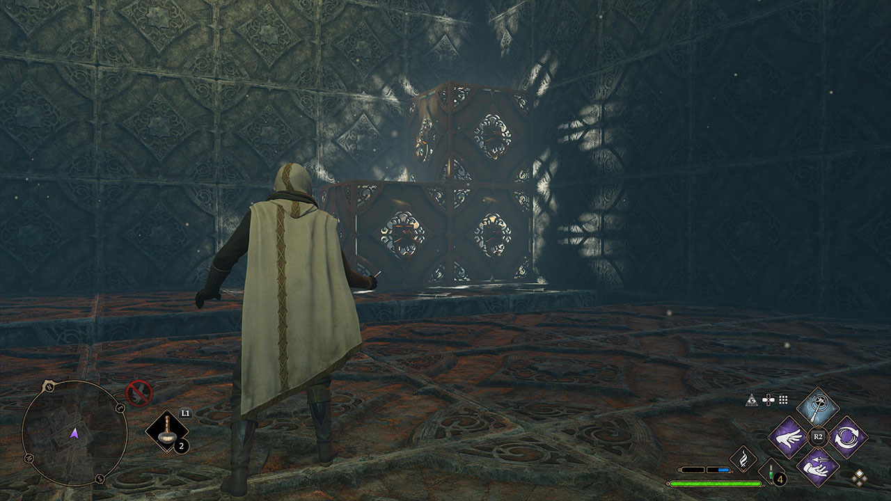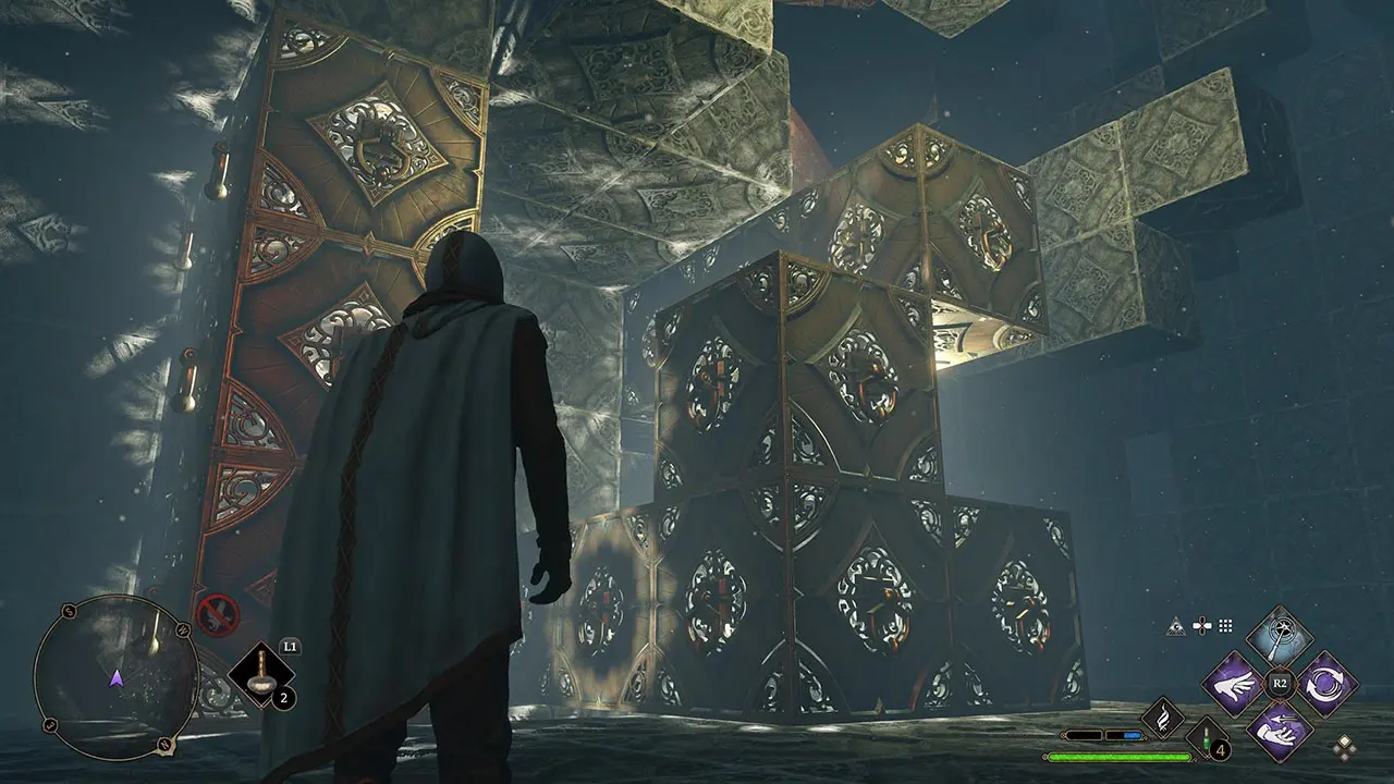 방에 들어가면 오른쪽 T자형 구조물에 연결될 때까지 왼쪽 L자형 구조물에서 Accio를 사용하여 퍼즐의 전반부를 풀 수 있습니다. 연결이 완료되면 Accio를 시전한 다음 구조 위로 점프하여 왼쪽 상자에 도달하고 방 퍼즐의 전반부를 완료하십시오.