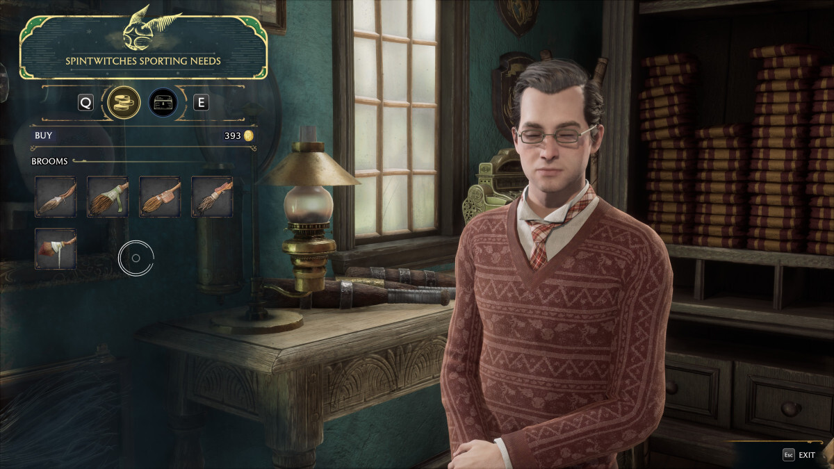 돈이 있으면 Spintwitches 상점으로 가서 상점 주인과 이야기하십시오. 5가지 스타일 중에서 선택할 수 있는 빗자루를 구입할 수 있습니다. 지도 곳곳에 흩어져 있는 다른 상인의 게임에서 사용할 수 있는 다른 빗자루 스타일이 있지만 그 스타일은 훨씬 더 비싼 경향이 있습니다(그 중 하나는 5,000달러에 가는 것을 봤습니다).