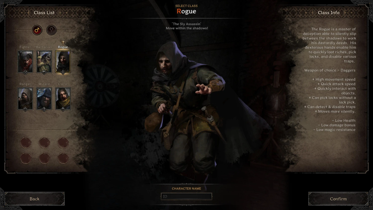 Rogue Class는 전형적인 스텔스 유형으로 몰래 숨어 적을 기습하는 데 능숙합니다. 그들이 선택한 가벼운 무기와 갑옷은 빠르고 조용하게 이동하고, 더 빠른 속도로 공격하고, 물체와 더 빠르게 상호 작용하는 능력과 같이 다른 클래스에 비해 상당한 이점을 제공합니다. 그들은 또한 자물쇠 따기 없이 자물쇠를 따고 적의 함정을 감지하고 비활성화할 수 있습니다. 이것은 잠금 장치가 없을 때 보물을 약탈하고 안전하게 탈출하는 데 도움을 주기 위해 팀에 도적을 두는 것이 매우 유용할 수 있습니다.