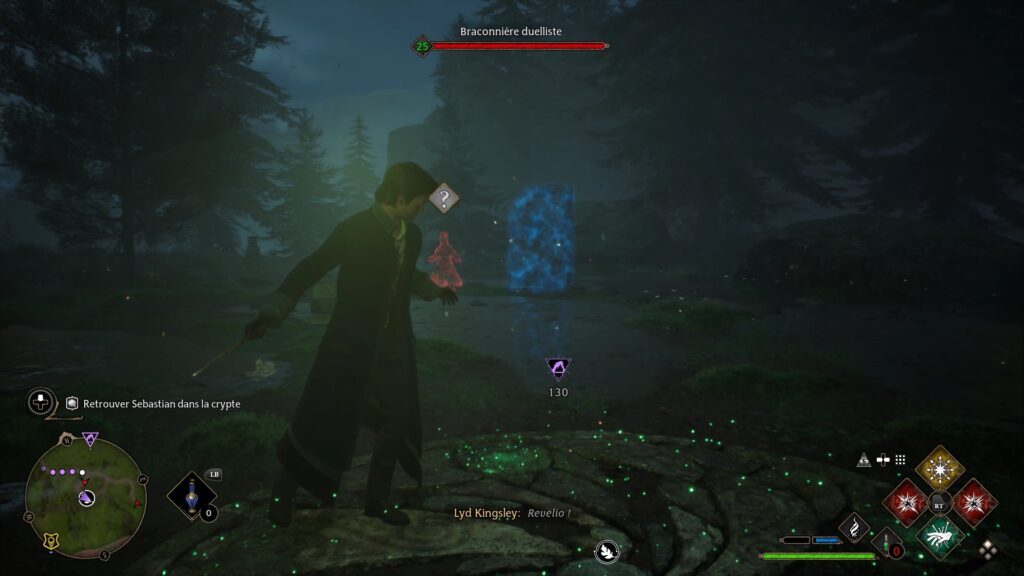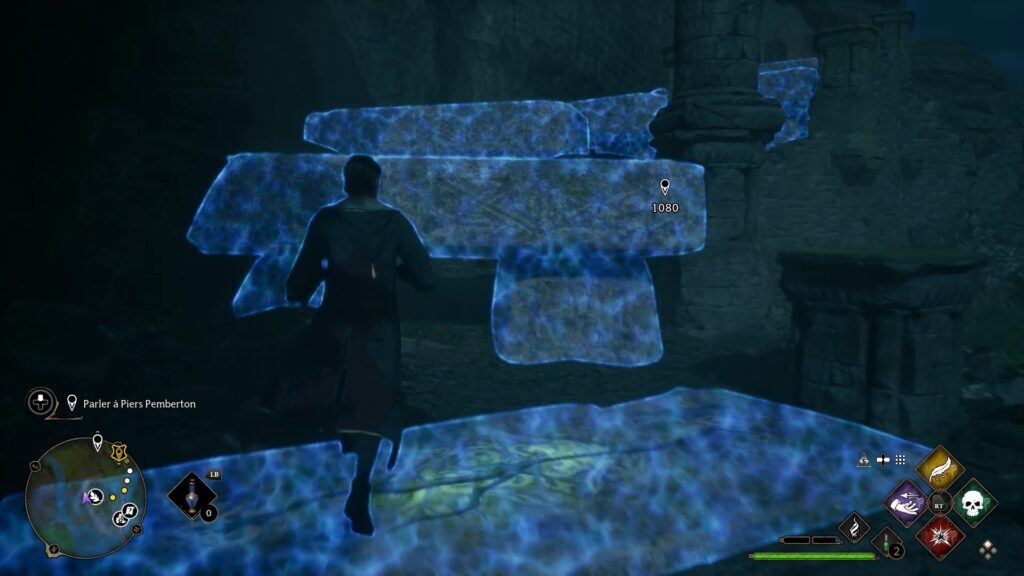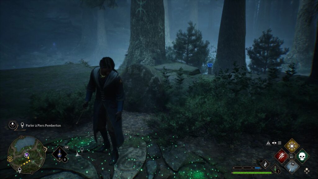 숲의 북동쪽으로 가면 멀린의 시험장이 있습니다. "North Marsh Entrance" Floo Flames 옆에 있습니다. 시작점에서 Revelio 주문을 사용하여 8개의 강조 표시된 돌이 나타나도록 합니다. 왼쪽 첫 번째 돌 위로 올라가서 돌 사이를 점프해야 합니다. 넘어지면 처음부터 다시 시작해야 합니다.
