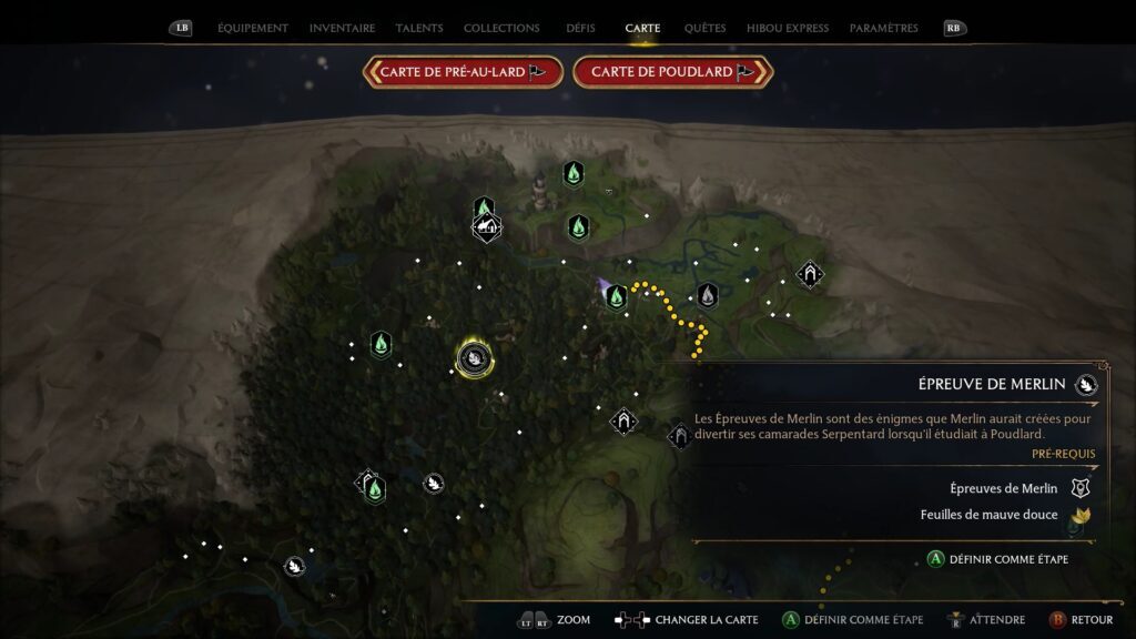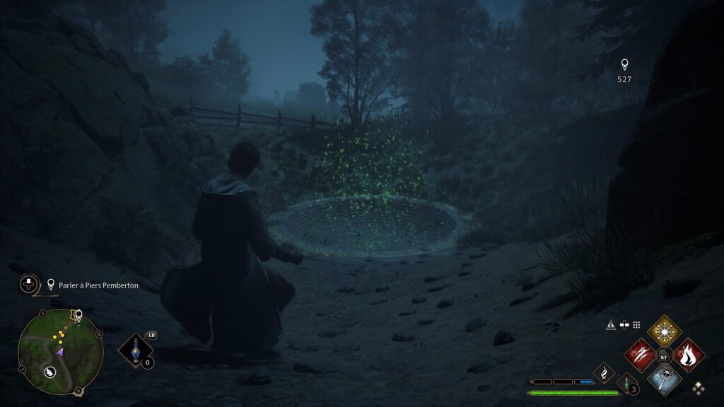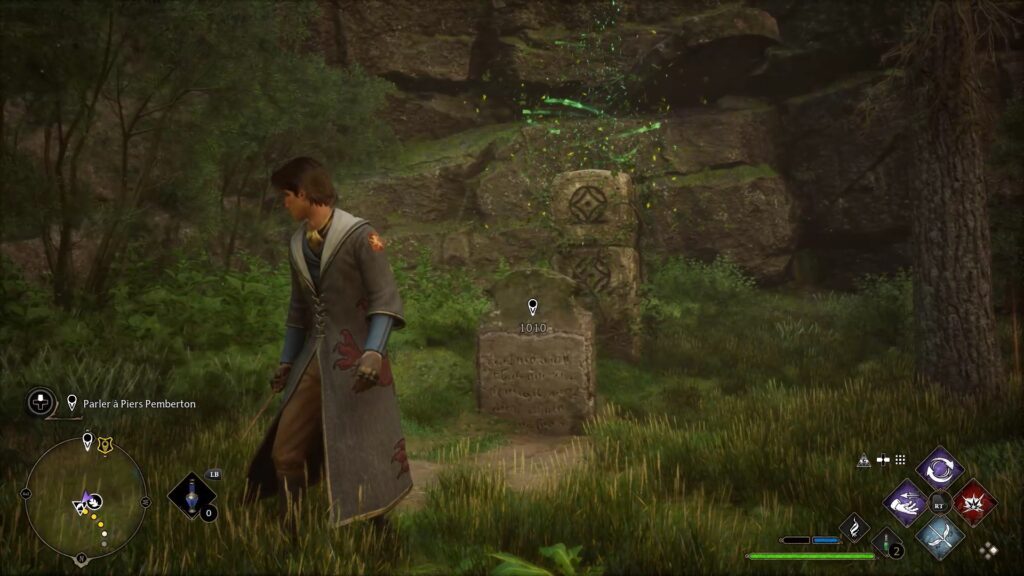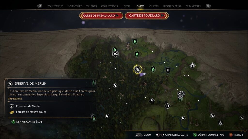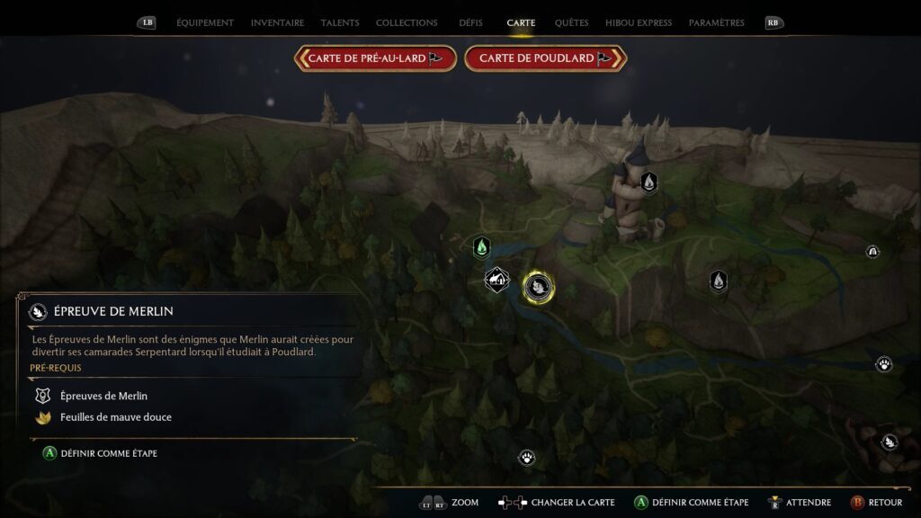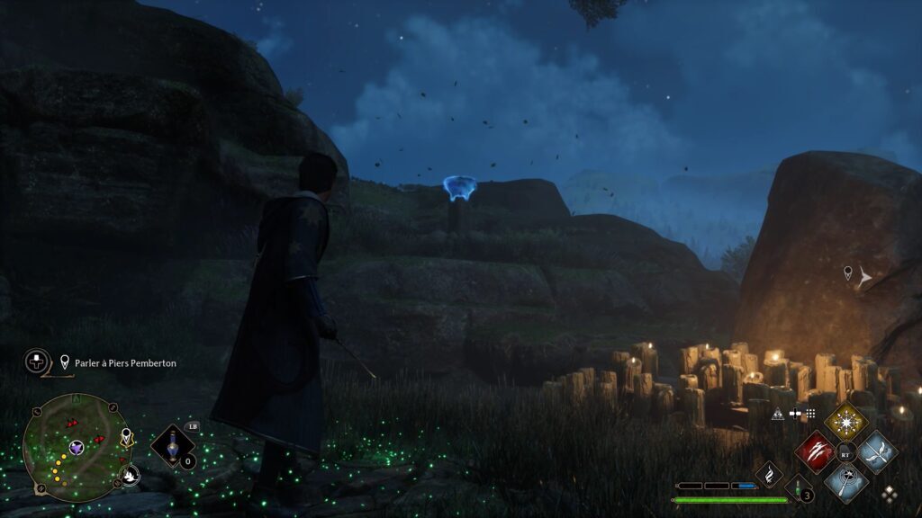 Merlin 테스트는 Floo Flames "Campolard-En-Haut"의 남쪽에 있습니다. Revelo를 사용하여 5개의 강조 표시된 돌을 발견하십시오. 스톤에 콘프링고 파워를 사용하여 스톤을 폭발시키고 시험을 완료하세요.