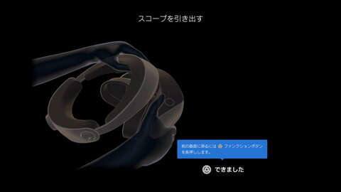 계속되는 초기 셋업이지만, 처음에는 헤드셋을 분리한 상태로 진행해 간다. 1스텝마다 모니터에 순서가 표시되므로, 화면의 표시에 맞추어 「헤드폰을 PSVR2에 접속한다」, 「장착용의 스코프를 꺼낸다」라고 하는 스텝을 실행해 간다. 「Meta Quest 2」는 스마트폰을 사용해 셋업해 나가지만, 그것을 PS5에 접속되어 있는 디스플레이를 사용해 행하는 것 같은 이미지다.