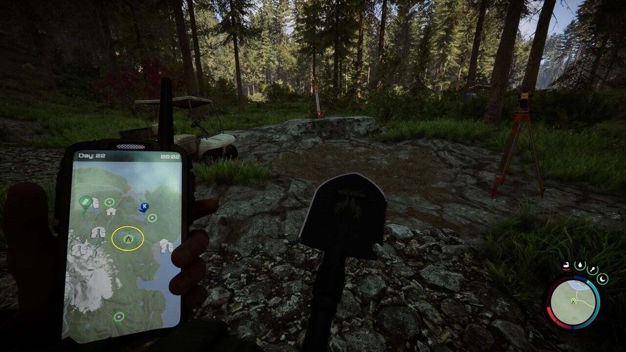 이제 삽을 얻었으니 숲 관리 키카드의 아들을 찾을 차례입니다. 삽이 있던 동굴을 기억하십니까? 글쎄, 당신이 해야 할 일은 서쪽에 있는 녹색 마커로 향하는 것뿐입니다(지도를 볼 때 산이 북쪽에 있다고 가정).