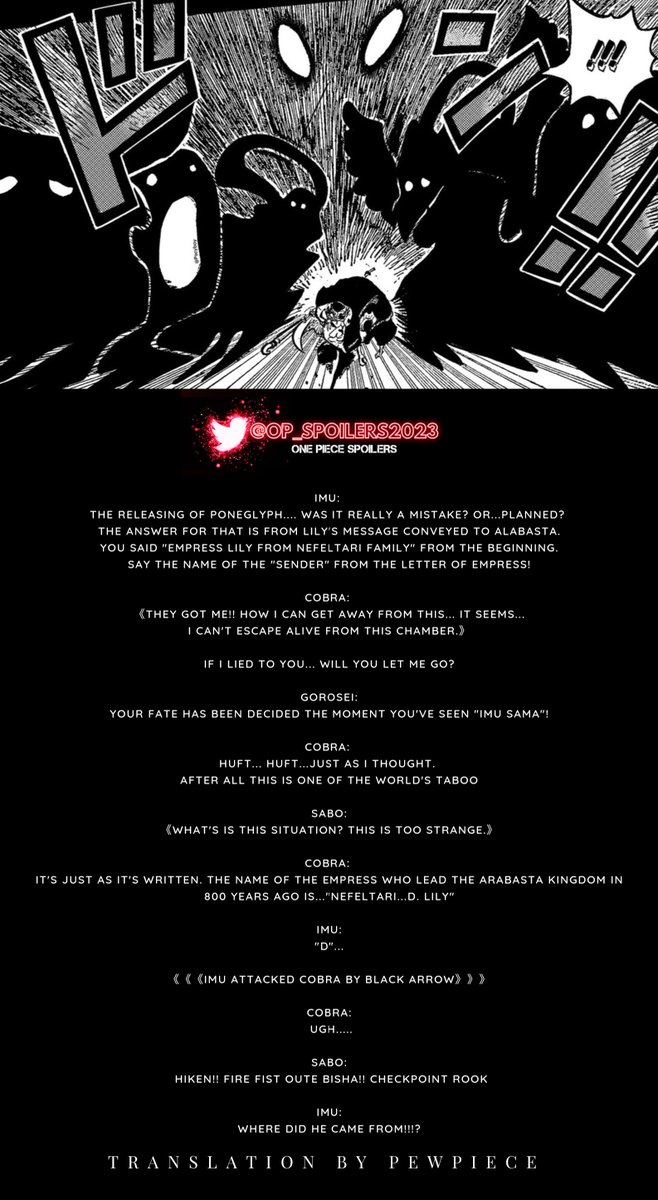 - 한편 이무는 릴리의 편지를 보낸 사람의 이름을 알고 싶어한다. Cobra는 그녀의 정식 이름이 "Nefertari D. Lily"라고 대답합니다. Imu는 Cobra 뒤에 검은 그림자가 나타나 그를 찌릅니다. 이것은 Sabo가 자신을 드러내고 Imu의 방향으로 불을 쏘는 때입니다. 이것은 이무가 송곳니를 가진 색조 괴물로 변신하고 사보의 불을 삼키는 때입니다.