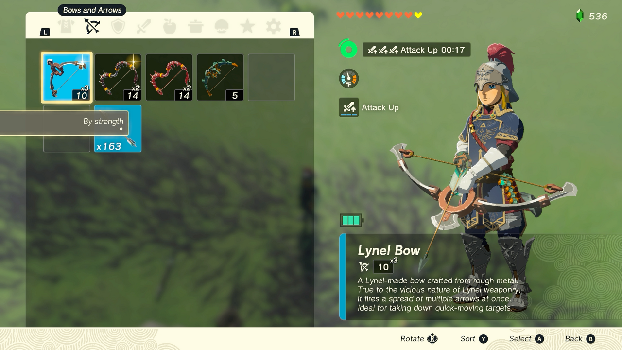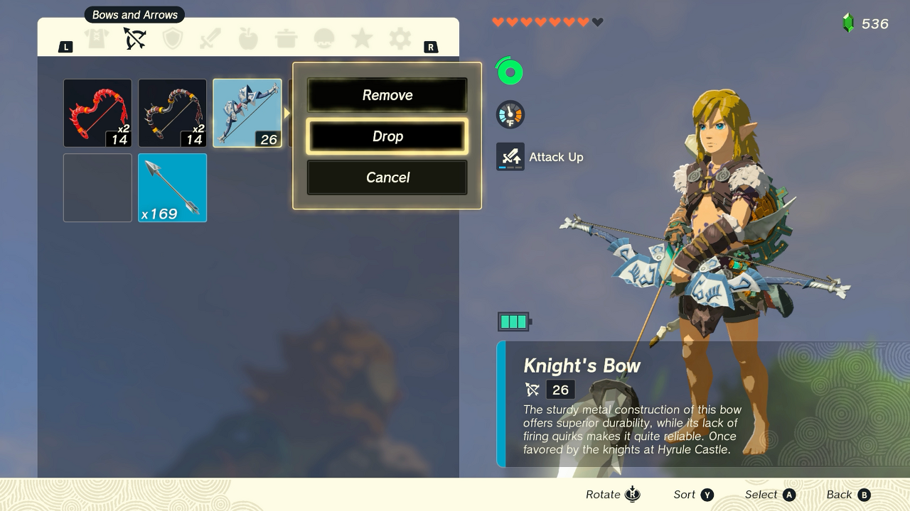 - +를 누르고 활과 화살 인벤토리로 이동합니다. 항목은 미리보기 창에서 Link의 화살표에 있습니다.