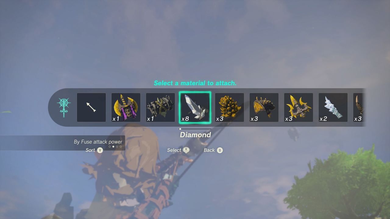 - 속이려는 항목을 첨부하십시오. 예를 들어 다이아몬드처럼. R2로 활을 그리고 방향 패드를 위로 누르고 재료를 선택하면 됩니다.