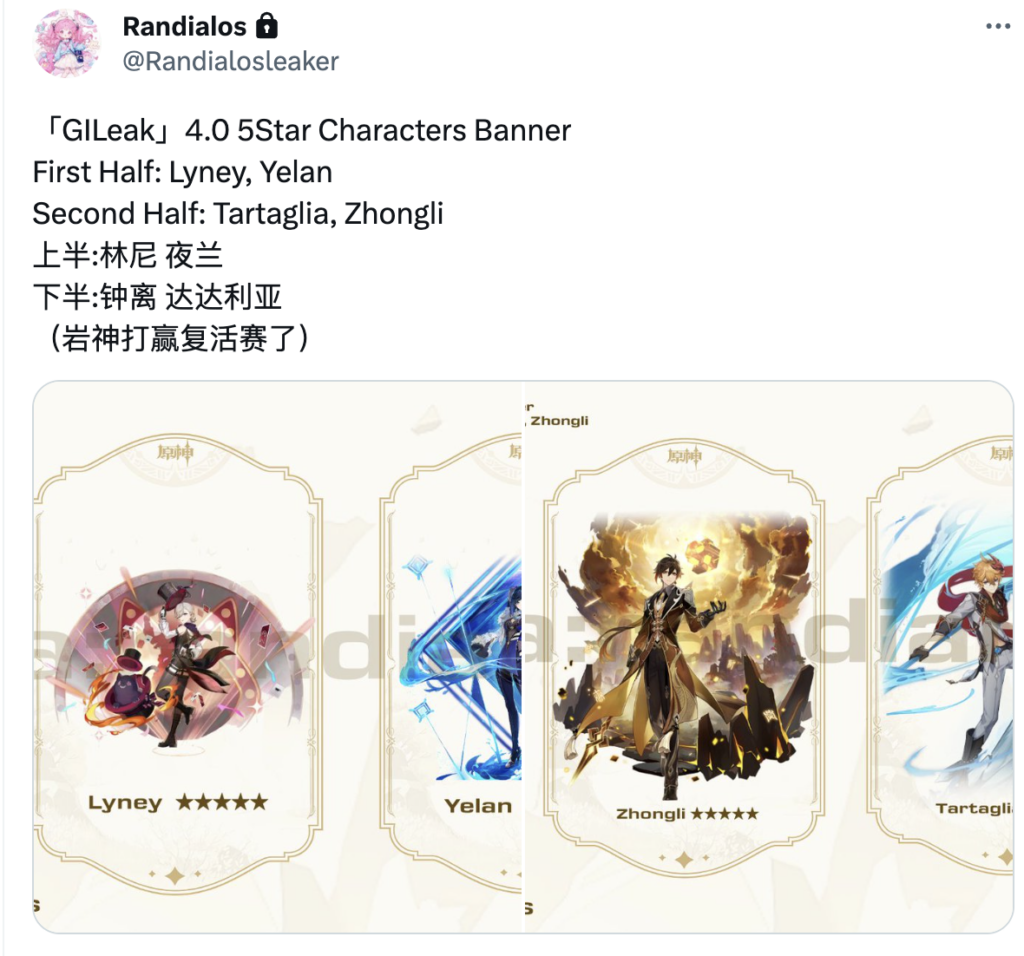 새 패치로 추가될 새로운 콘텐츠에 대한 궁금증과 함께 다음 배너 속 우리는 누구와 마주하게 될지 궁금증도 치솟는다. 명단에 있는 이전 캐릭터 중 두 번째 단계에서 누가 돌아올까요? 유출자는 이미 답을 알고 있는 것 같습니다.