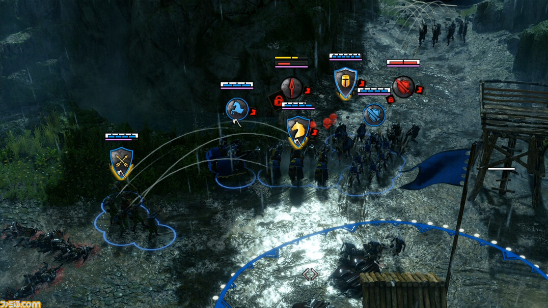 예를 들어, 각 스테이지에 점재하는 거점 “마을”에서는 보충 캠프와 같이 유닛의 회복은 할 수 없지만, 스테이지내에서 입수한 자재를 사용하는 것으로, 울타리나 감시대 등을 취락의 주변에 설치할 수 있다. 이들을 사용하면 적의 이동이나 돌격을 저해하거나 궁병의 시야와 공격 범위를 보다 넓히는 등의 새로운 전략을 전개할 수 있다.