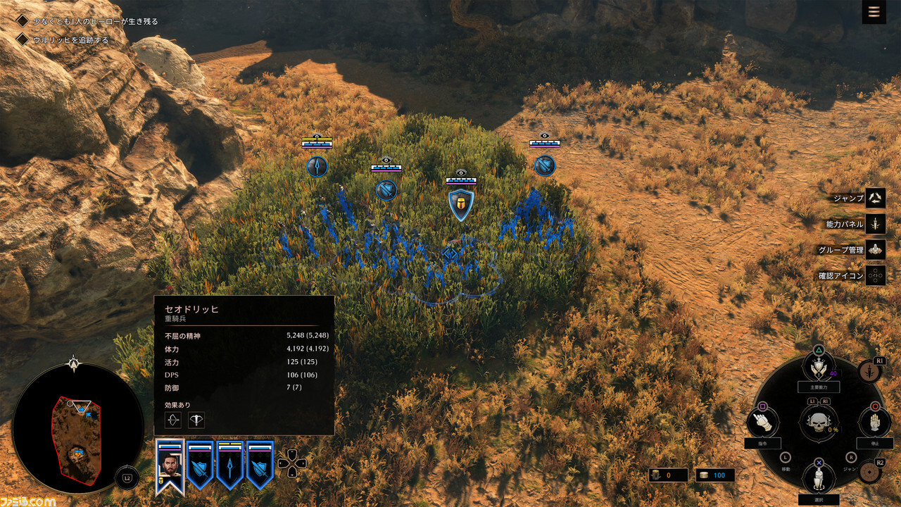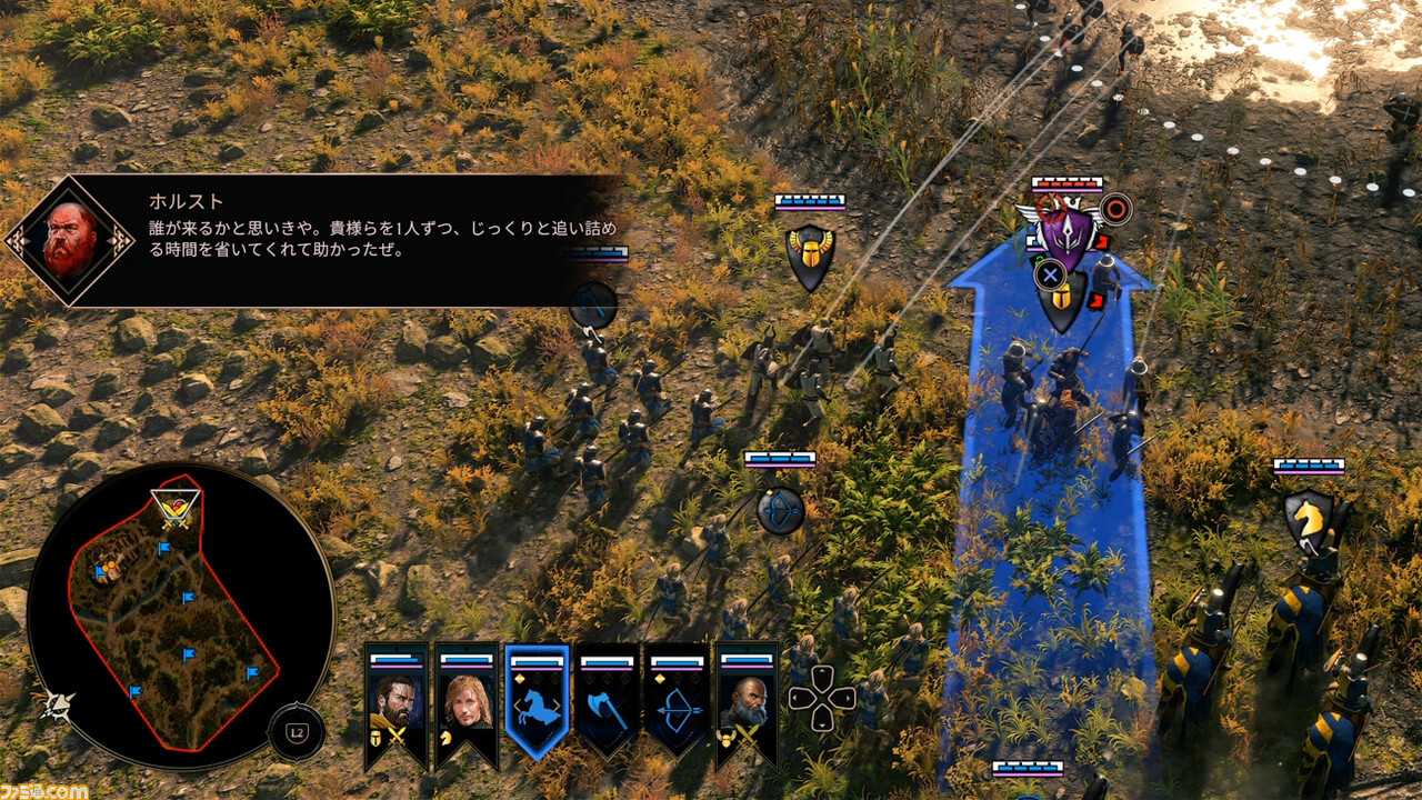 이 원형 범위가 사용하기 어려운 경우에도 십자 키의 아래 버튼을 입력하면 그냥 화면 내 모든 유닛을 일괄 선택할 수 있습니다. 그 후에 특정 유닛을 지정에서 제외하는 것도 십자 키의 좌우로 해당 유닛을 선택하고 R1(RB) 버튼을 누르면서 십자 키 아래 버튼을 넣는 간단한 조작으로 가능하다.