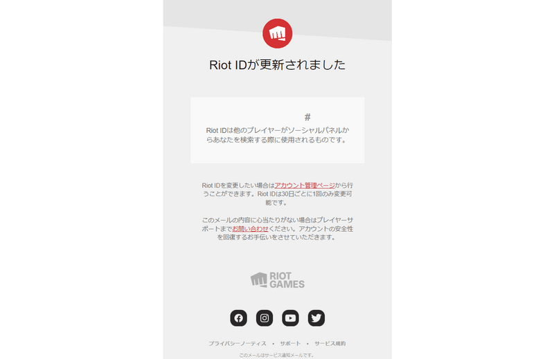 RIOT ID가 변경되면 설정한 이메일 주소에 변경된 ID가 통지됩니다.
