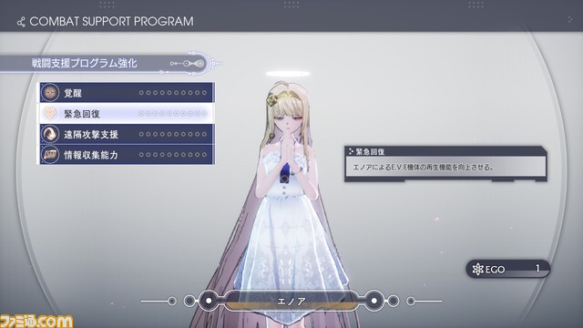EGO는 에노아의 전투 지원 프로그램의 강화에도 필요. 각 프로그램의 사용 횟수나 효과량, 효과 시간을 강화할 수 있기 때문에 상당히 중요한 요소가 되고 있다. EGO는 불필요한 무장 강화 카트리지, 인격 강화 데이터, 현속기를 매각하면 손에 들어가는 것 외에 다과회에서 대화를 할 수 있다. 스토리에 그다지 흥미가 없는 순수한 액션 게이머도, 꼭 다과회는 놀으면 좋겠다. 캐릭터의 매력과 귀여움이 남지 않고 막혀 있을 뿐만 아니라, 육성도 추구할 것이다.