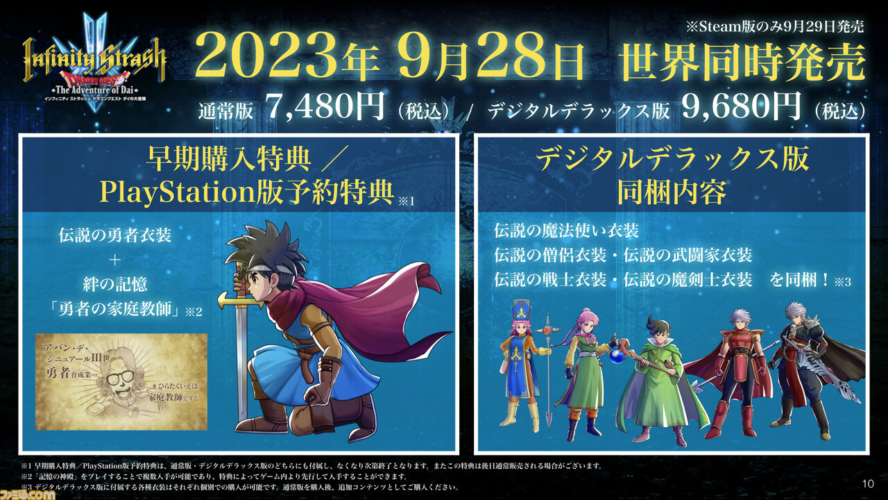 스퀘어 에닉스에서 2023년 9월 28일 발매 예정(Steam판은 9월 29일 발매)의 Nintendo Switch, PS5, PS4, Xbox Series X|S, PC(Steam, Microsoft Store)용 액션 RPG, '인피니티 스트래쉬 드래곤 퀘스트 다이의 대모험 ' .