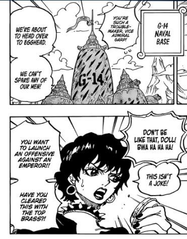 에그헤드로 향하는 해병들 중 특히 루피의 할아버지인 거프가 눈에 띈다. Doll과의 통화에서 후자는 Akainu의 명령과 Egghead로 향하는 긴급성을 설명하고 Garp에게 G-14의 군대를 훔치지 말라고 간청했습니다. 그러나 전설적인 해병은 새로 선출된 조카 Yonko와 관련된 문제에 전혀 관심이 없음을 보여주었습니다.