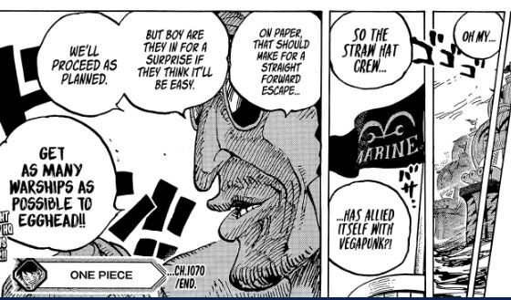 우리는 Kizaru가 Egghead에 도착하는 것이 전략에서 어떻게 예견된 것처럼 보였는지 기억해야 합니다. 그러나 1070장과 1071장에서 발견한 내용에 따르면 이제 사용 가능한 다른 모든 선박도 과학의 섬으로 향하라는 명령을 받았습니다.