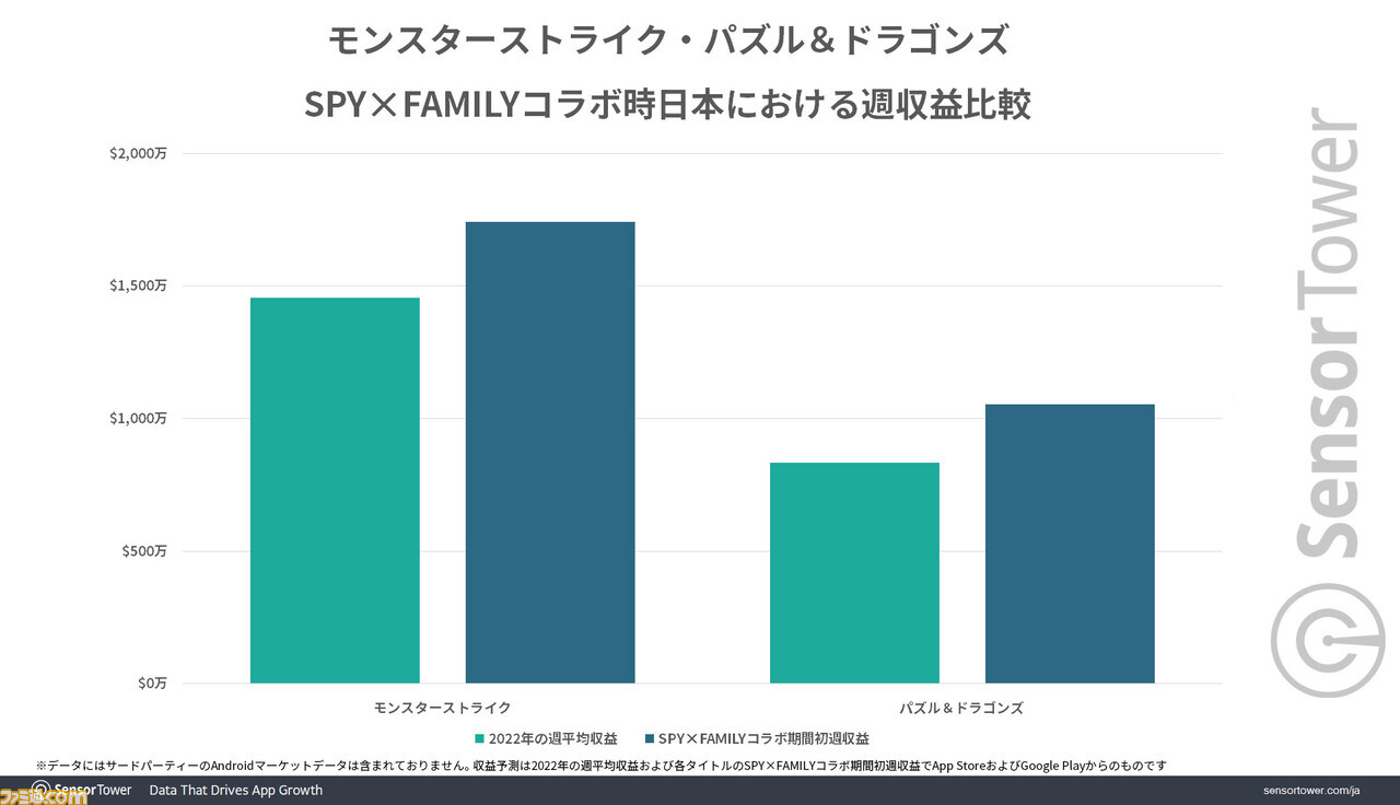 두 모바일 게임 모두 'SPY×FAMILY' 콜라보레이션 당일 일본 앱 스토어에서 최고 수익 순위에서 순위를 올렸다. Sensor Tower의 데이터에 의하면, 「몬스터 스트라이크」는 콜라보 전날(2022년 5월 26일)의 3위로부터 콜라보 당일에는 1위에, 「퍼즐 & 드래곤즈」는 콜라보 전날(2023년 6월 25일) 의 10위부터 콜라보 당일에는 1위에 랭크 업했습니다. 그 후 7일간 두 타이틀 모두 Top10권내를 유지하고 있습니다.
