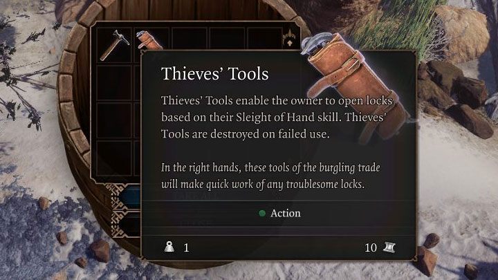 자물쇠 따기에 능한 캐릭터에게 도구를 주는 것은 매우 중요합니다. 자물쇠를 여는 데 실패하면 도둑의 도구가 인벤토리에서 사라지기 때문입니다 . 그러나 자물쇠 따기에 성공하면 도구가 사라지지 않고 나중에 다시 사용할 수 있습니다.