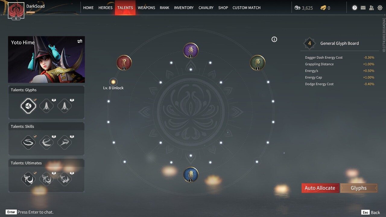 여기에서 캐릭터의 능력치를 강화하는 글리프 장착을 시작할 수 있습니다. 또한 여기에서 일부 기술을 전환할 수 있지만 시간이 좀 더 걸립니다.