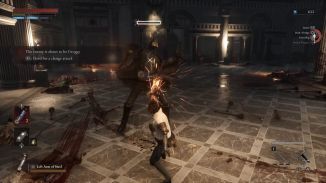숄더 런지 외에도 퍼레이드 마스터는 러닝 벨리플롭을 수행하여 거리를 좁힐 수도 있습니다. 이는 뒤로 점프하여 피할 수 있으며, 긴 회복 시간으로 인해 보스는 충전 공격에 취약해집니다.