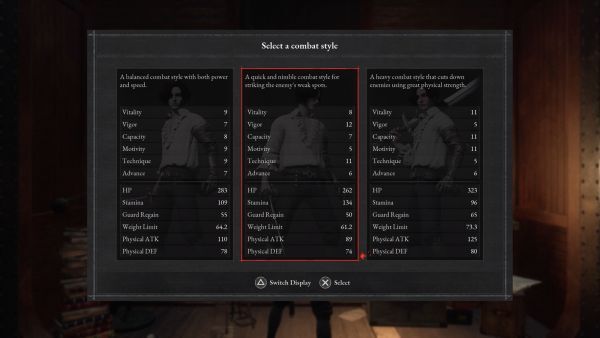 Dark Souls 게임 과 마찬가지로 초기 "클래스" 선택에 따라 게임을 시작할 기본 능력치와 무기가 결정되지만 모든 무기는 게임 내내 획득할 수 있습니다.