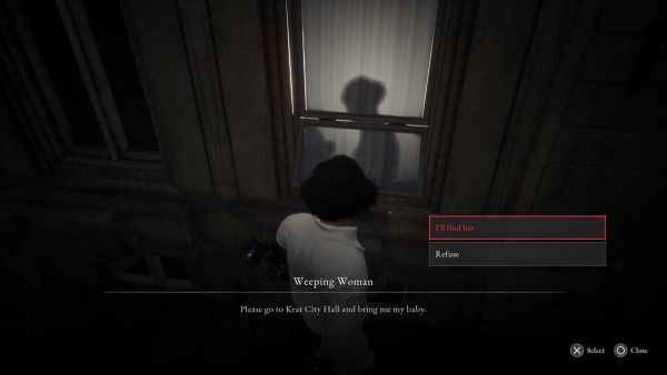 안뜰 왼쪽에서 Krat News Issue 1124를 수집한 다음 반대편으로 건너가면 우는 여자를 위한 부서진 아기 인형을 지키고 있는 Krat Brute를 만날 수 있습니다 . 이제 시청 안에 있는 크라트 보병 두 명을 처치하고 건물 왼쪽에 있는 상자를 열어 인형 파괴자의 부적을 얻을 수 있습니다 .