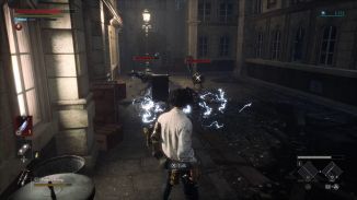 안뜰을 나와 뒤집힌 마차 근처에서 찢어진 낙서를 집어든 다음 돌아서 거리를 따라가면 경비견과 크랏 보병을 만나게 됩니다. 지금까지 마주했던 일반적인 적들과는 달리, 크랏 보병들은 검을 휘두르며 무기로 공격을 막아낼 수 있는 잘 훈련된 병사들입니다. 즉, 그들은 여전히 뒤에서 치명적인 공격을 받기 쉬우며 퍼펙트 가드를 사용하면 무기를 부술 수 있습니다.