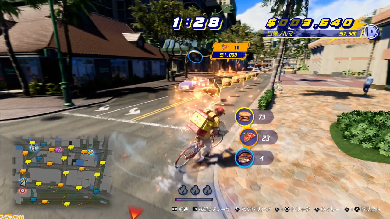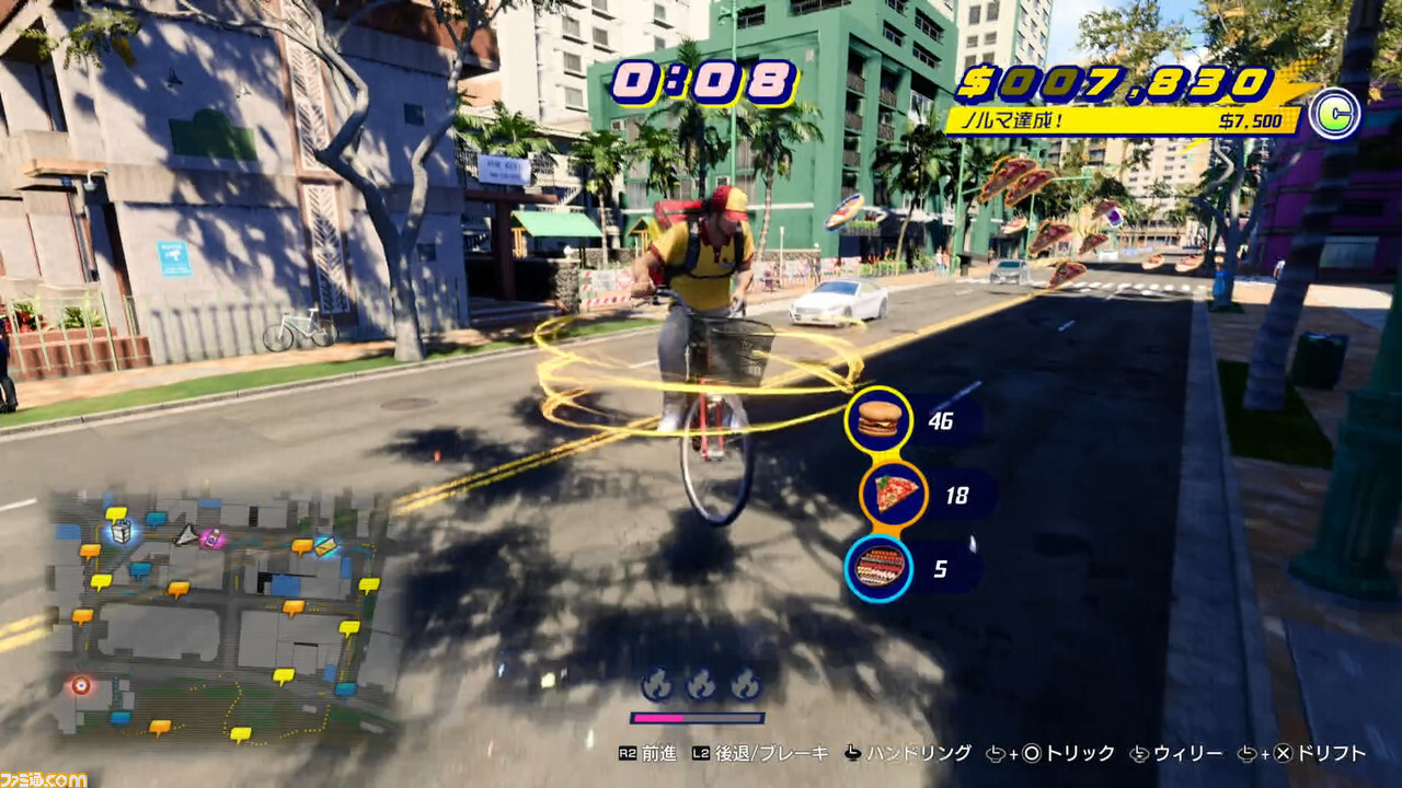 물론, “미친”이라고 명중하고 있을 뿐, 단지 배달 게임이 아니다. 윌리나 드리프트, 트릭을 정해 배달하면 배달 요금이 오르고, 게이지를 모아 미친 모드를 발동하면 스피드 업하면서 광범위한 요리를 모을 수 있습니다. 게다가 거리에 있는 특수 효과를 사용해 “스페셜 점프”를 하면, 특별 보너스를 받을 수도 있다. 어쨌든 상쾌감 발군의 드라이빙(라이딩?) 게임으로 완성되고 있다.