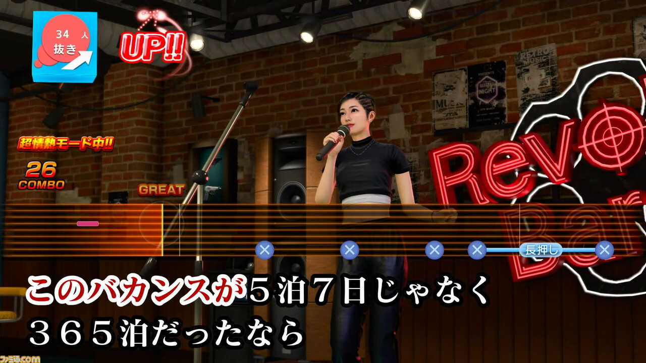 비교적 초기의 시리즈작으로부터 인기 스폿으로서 등장하고 있던 노래방(리듬 액션 게임)은 본작에서도 등장. 시유판에서는, 「악마의 지옥 냄비」(카스가 제일), 「JUDGMENT-심판-」, 그리고 「Honolulu City Lights」(치토세)의 3곡을 즐겼다. 순조롭게 플레이해 가면, 그 곡에 맞는 영상을 볼 수 있는 것은 언제나 그대로인데, 「Honolulu City Lights」에서는 해변에서 카스가와 놀리는 수영복 차림의 치토세의 모습이 그려지는 것에. 신 캐릭터이며, 동료도 되는 치토세가 신경이 쓰이는 사람에게는, 꼭 이 노래방을 즐겨 주셨으면 한다.