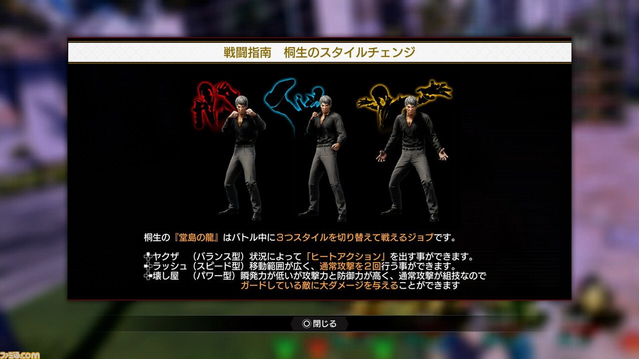 이것만이라면 놀라지 않지만, 무려 본작의 키류에는 독자적인 시스템이 짜넣어지고 있었다. 우선 배틀 중에 "야쿠자(밸런스형)", "러쉬(스피드형)", "파괴자(파워형)"라는 3가지 스타일을 변경할 수 있는 것에 놀라움.