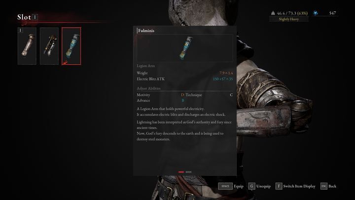 전기로 적을 공격할 수 있는 풀미니스(Fulminis)도 있습니다 . 이러한 각 팔에는 통계와 스케일링이 다르기 때문에 Motivity에 소비한 포인트가 많고 이 카테고리에서 무기의 스케일링이 A 또는 S 등급인 경우 장착을 고려해 볼 가치가 있습니다.