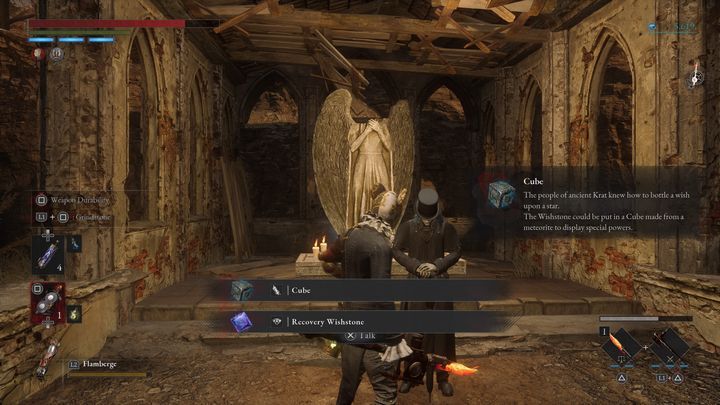Giangio와 대화하여 큐브를 수정할 수 있습니다 . 처음에는 회복 위시스톤만 소유하게 됩니다. 이런 유형의 돌 위에 커서나 아날로그 스틱을 올려놓고 큐브에 배치하여 장착하세요 . 마지막으로 이 아이템을 벨트에 할당하면 빠르게 사용할 수 있습니다.