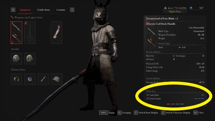 모든 무기에는 고유한 우화 예술이 있습니다. 이는 특수 공격일 수도 있고 무기 강화 일 수도 있습니다 . 피노키오는 하나의 무기를 들고 두 가지 스킬을 사용할 수 있습니다. 무기 칼날과 손잡이가 있습니다. 적절한 수의 Fable 슬롯이 있으면 이러한 능력을 사용할 수 있게 됩니다.