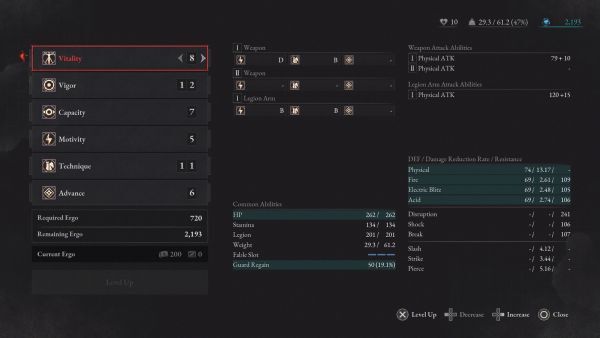 HP, 체력, 무기 피해량, 다양한 유형의 공격에 대한 저항, 상태 이상과 같은 P의 기본 통계를 변경하기 위해 증가시킬 수 있는 총 8가지 속성이 있습니다.