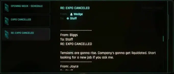 "거미와 파리"라는 미션 중에 Expo 컴퓨터에 저장된 이 이메일을 찾을 수 있습니다. 그 안에 있는 대화는 Wedge Antilles와 Biggs Darklighter에 대한 명확한 언급인 Wedge와 Biggs 간의 대화입니다. 반란군 연합 조종사 두 명과 루크 스카이워커의 친구들.