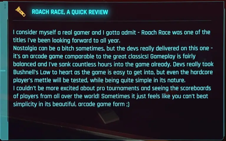Capitan Caliente 얘기가 나와서 말인데, 그 안에는 Roach Race 아케이드 게임에 대해 이야기하는 누군가가 보낸 이 메시지가 있습니다. Roach는 The Witcher의 주인공인 Geralt of Rivia의 말입니다.