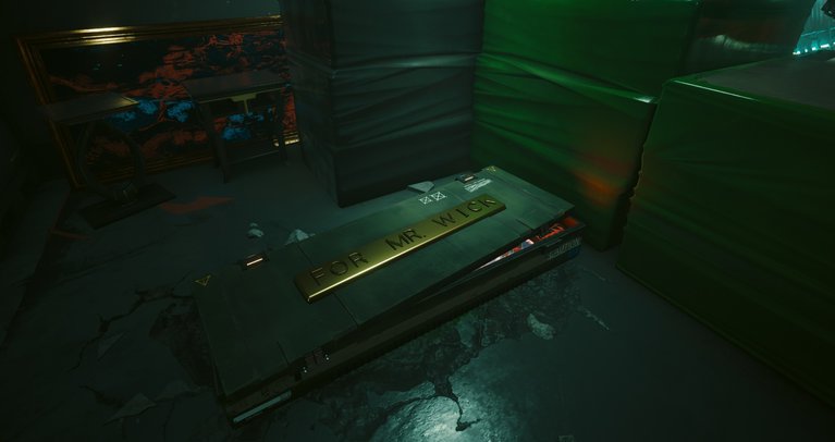 "For Mr. Wick"이라는 메시지가 새겨진 금판이 있는 상자 옆에 케이스가 있습니다. 얼마나 멋지나요?
