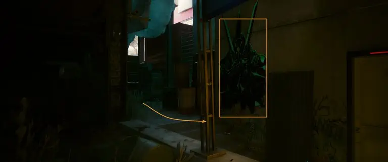 The Moth로 이어지는 계단 아래에서 서쪽으로 어두운 뒷골목으로 이동한 후 흰색 Militech 상자를 지나 레스토랑이 있는 건물 왼쪽 벽에 있는 벽화를 찾으세요.