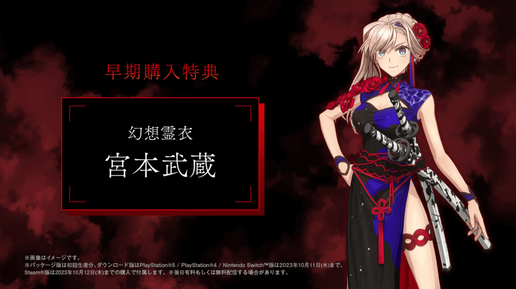 본작의 조기 구입 특전은 게임 내에서 사용 가능한 환상 영의 '미야모토 무사시'다. 패키지판의 경우는 첫회 생산분까지, 다운로드판의 경우는 발매로부터 약 2주간 이내에 구입하면 부속된다.