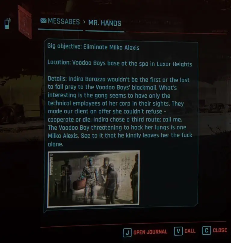 이 작업은 Voodoo Boys와 함께 일하는 Milko Alexis라는 남자에게 협박을 받고 있는 여성 Indira Barazza가 의뢰했습니다. 귀하의 목표는 간단합니다. 은신처에 침투하여 고객의 생명을 위협하는 사람을 죽이는 것입니다.