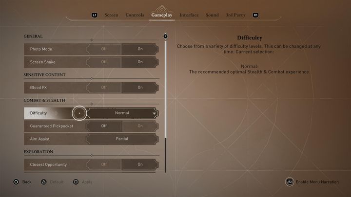 AC Mirage를 처음 실행하면 게임에서 초기 설정을 선택하라는 메시지가 표시됩니다. 그중에는 난이도를 담당하는 옵션이 있습니다.