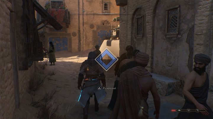 도둑질에 성공하려면 바그다드 거리를 배회하는 군중 속에서 한 사람을 찾아 뒤에서 다가가야 합니다 . 적절한 거리에 있으면 도둑질을 위한 키/버튼과 함께 피해자 위에 텍스트 풍선이 나타납니다. 훔치려면 해당 버튼을 누르세요 .
