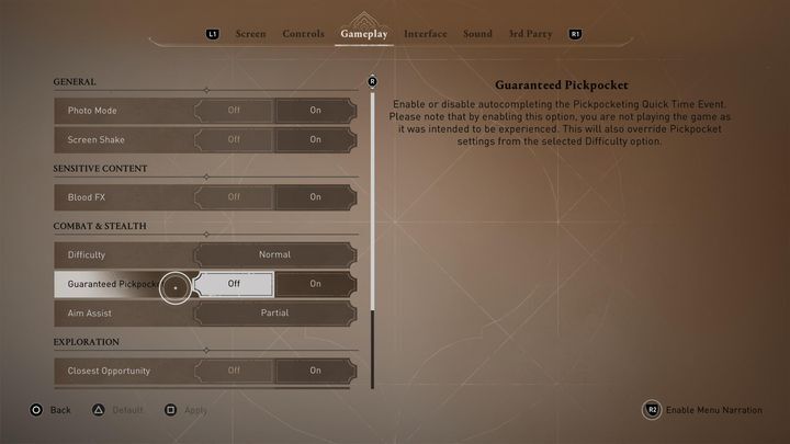 QTE 메커니즘의 팬이 아니거나 도둑 미니 게임에 문제가 있는 경우 완전히 비활성화 할 수 있습니다 . 이렇게 하려면 설정 메뉴로 이동한 다음 "게임플레이" 탭으로 이동하세요 . 여기에서는 도난 보장을 활성화하거나 비활성화하는 옵션을 찾을 수 있습니다 . 관심 있는 옵션을 선택한 다음 "적용"을 클릭하여 새 설정을 저장하세요.