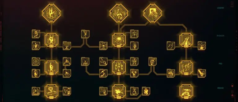 계통도 내 주요 경로는 본질적으로 능력치 버프를 제공함으로써 스마트 무기의 주요 단점을 제거하거나 최소화하는 데 중점을 둡니다. 스마트 무기는 상위 3개 속성 요구 사항 계층(Pro, Phenom, Legend)에서 특전을 얻습니다. Rookie 계층은 완전히 연결이 해제되어 일부 차량에 대해 Quickhack을 실행할 수 있는 능력을 제공합니다.