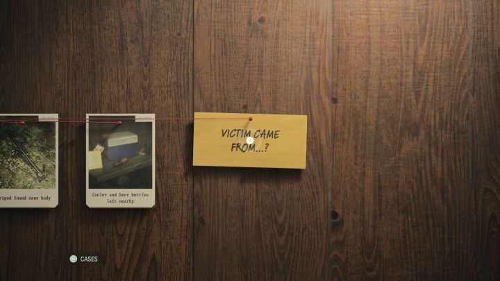 - Mind 장소로 이동하여 Case 보드 와 상호 작용해야 합니다 . 기본적으로 가마솥 호수 살인 사건 수사에 관한 것이지만 나중에 다른 사건의 파일로 전환할 수도 있습니다.